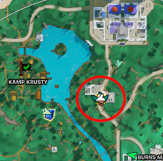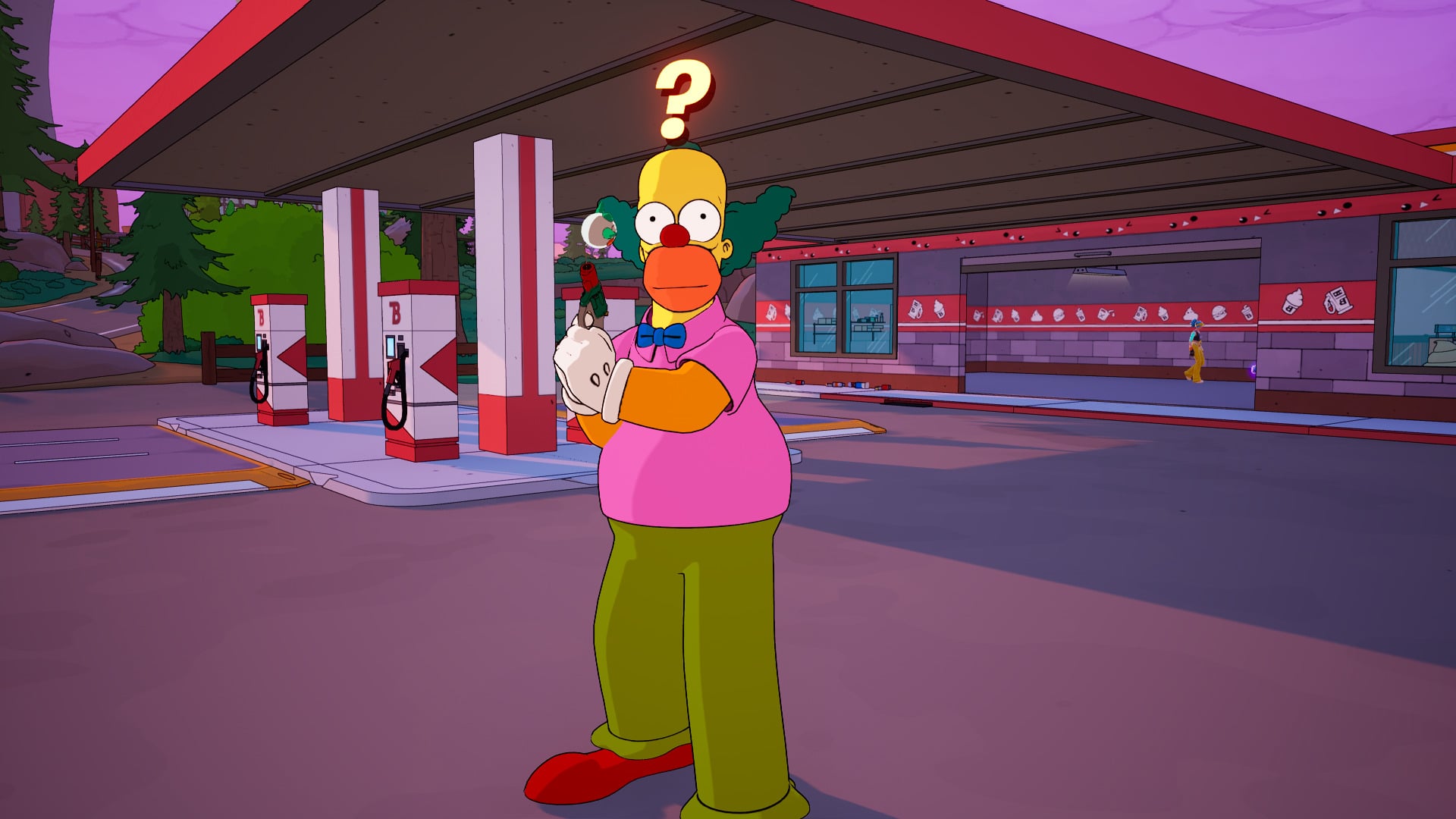 As you might expect, Krusty the Clown typically spawns around Kamp Krusty. We encountered him in a few instances, one of which occurred at the gas station located east of Kamp Krusty. You can see that spot marked on the map above. However, in general, your best approach is to roam around this area until Krusty spawns.