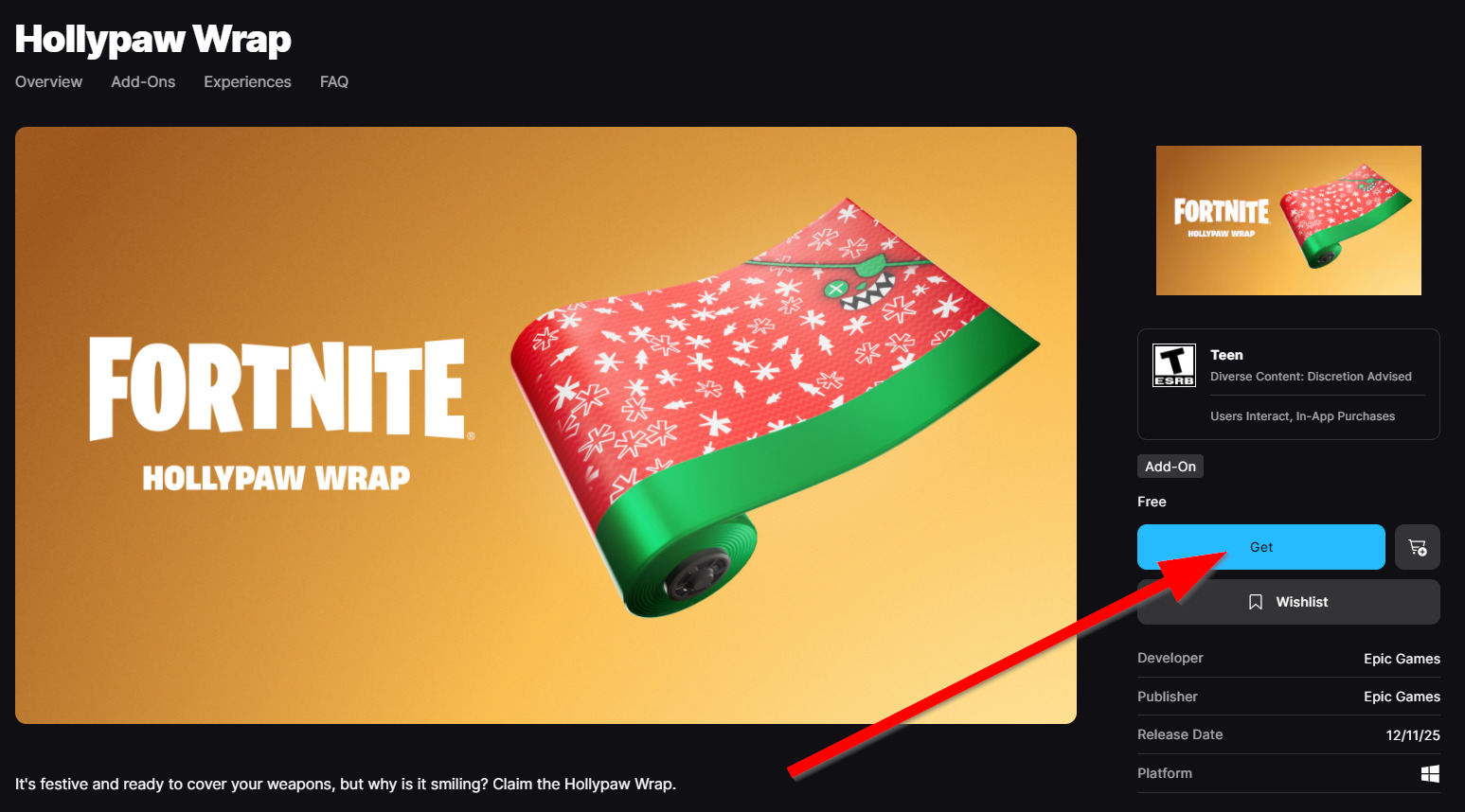 You can find this item on the Epic Games Store either online or through the Epic Games Launcher. Once there, you should see a category called 'Epic Extras,' with the Hollypaw Fortnite Wrap clearly visible. You should be able to claim the Wrap for free without issue.