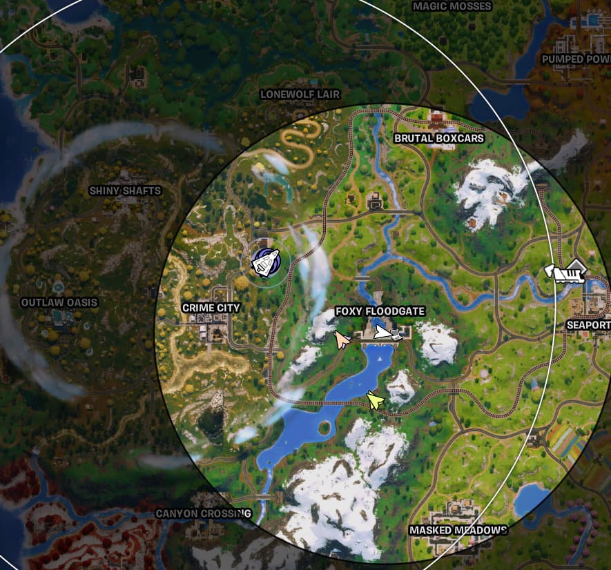In our limited experience, the Rift often spawns near the middle of the map. A good spot to land is Foxy Floodgate, since it's the point of interest (POI) closest to the center and offers Launch Pads for mobility. Otherwise, as mentioned in the previous tip, try to land on a mountain with a Launch Pad.