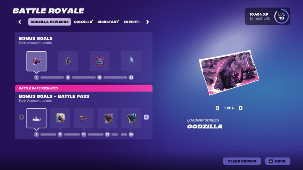 Every two account levels earned, you will unlock one of the 12 Godzilla cosmetics. You must earn 12 to unlock the base Godzilla Fortnite skin and 24 to receive the Energized Godzilla alternate style.