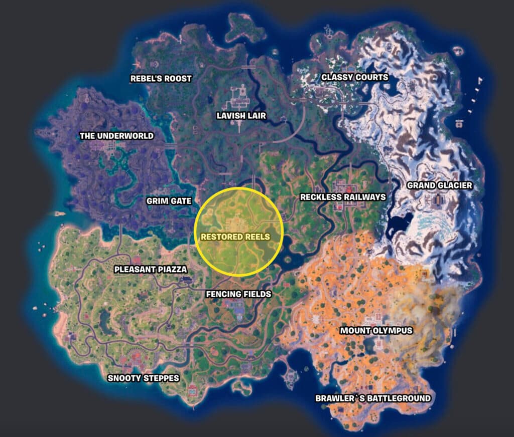 Well, first, you need to locate Restored Reels on your map. Lucky for you, Restored Reels is pretty easy to point out. Look directly in the middle of the map, and you will see it.