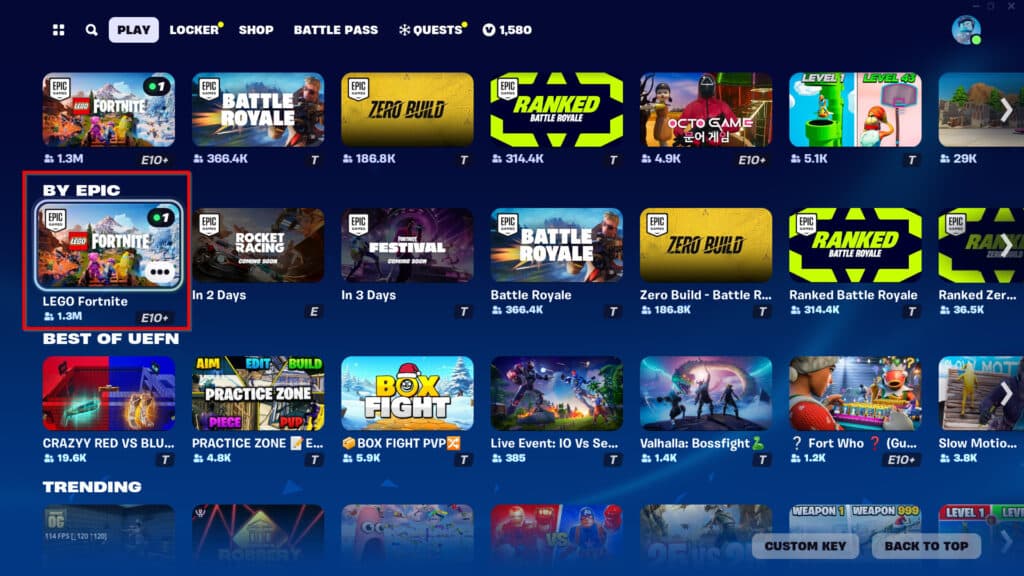 - Now, scroll down until you find the 'By Epic' category. LEGO Fortnite should be the first game mode listed. Click on the box.