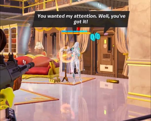 She provides a tricky challenge. You must attack a small white circle to damage her properly, and then you can chip away at her health as usual. However, she can regenerate health, so you must be accurate with your shots to end the battle quickly.