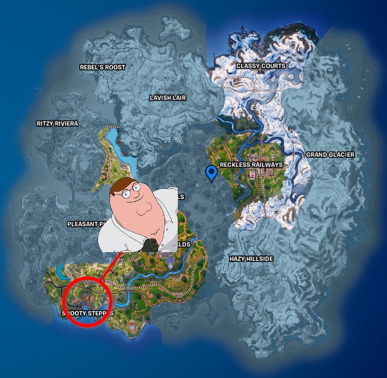 Peter Griffin spawns in Snooty Steppes, located on the southwestern quadrant of the map. Like most boss characters, he roams the area and will attack you alongside a seemingly endless group of NPC henchmen. Defeating him can be tricky, so let’s cover some strategies.