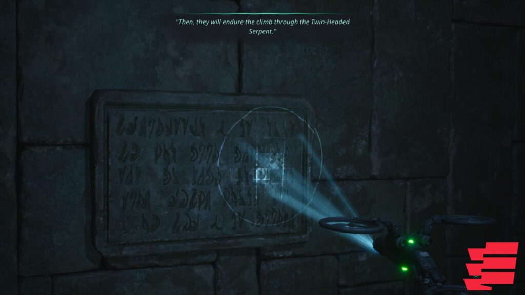 How exactly did we come to this conclusion? The answer lies in the area to the right of this door. You will find three different inscriptions that contain obvious hints for the dial puzzle. Use your drone to analyze and decipher these writings on the walls.