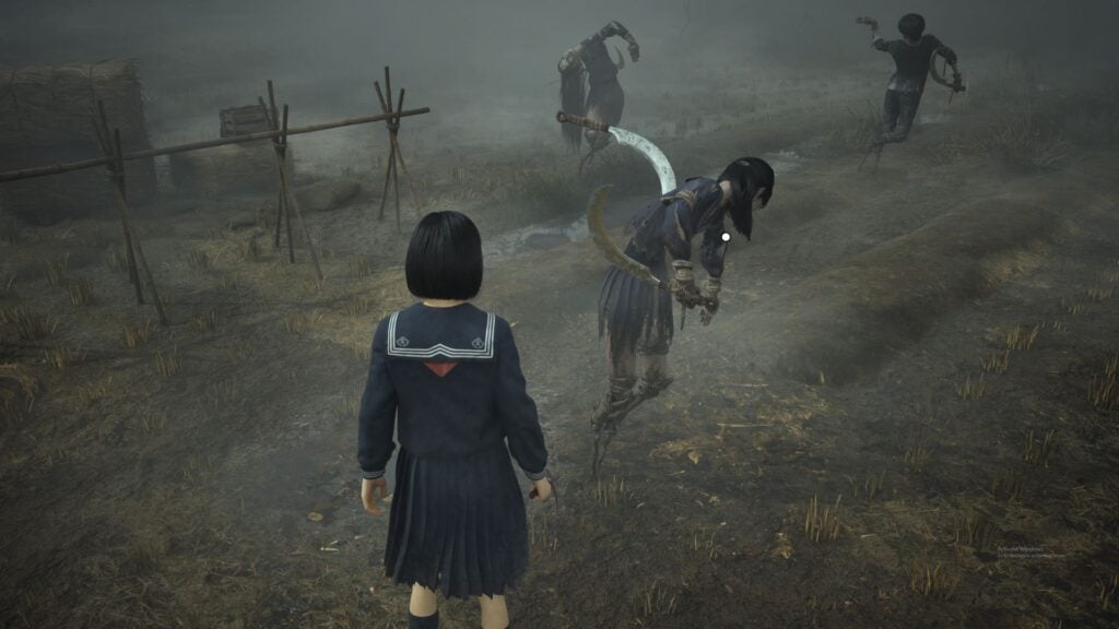 The path on the right leads to a dead end. Instead, turn left and take the first right. Beyond the scarecrow, you’ll find crops drying — watch for the fog monster attacking from the field.