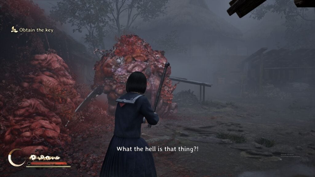 You can find a bunch of healing materials on the left, so don’t forget to explore that side. The path to Rinko’s house lies on the right. As you move forward, prepare to be jumped by another monster with red growth on its face. This one’s pretty tricky to dodge as it will barge straight from the right and won’t give you much time to react. Once you’re done with it, continue in this direction, beyond the red outgrowths, until you hear Shu’s voice. Now it’s time to prepare for a gruesome boss fight.