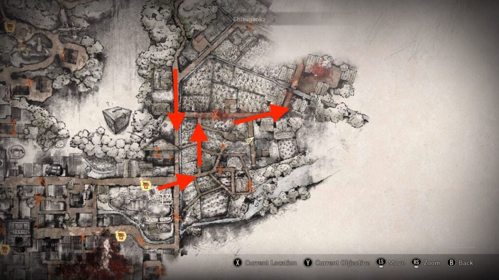 Take the path downwards from the forest and reach the edge of the rice fields. There, Shu will ask you to head to Rinko’s house. From here on, head straight and take the third narrow pathway on the left, as marked in the screenshot above.