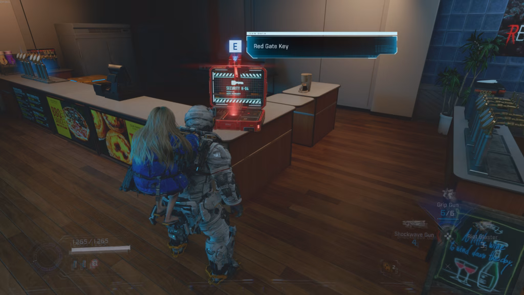 For example, the first Red Zone you stumble across in Pragmata is in the second level of the main story, which takes you to a reimagined version of New York City. While walking through the main path, you’ll find a Red Zone and see that you need a Red Gate Key. Of course, you won’t have one yet, but if you keep walking a little further, you’ll find a Red Gate Key sitting on top of a restaurant counter.