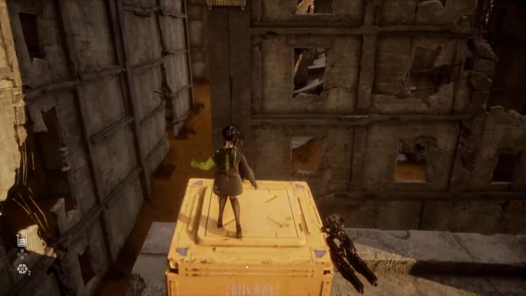 After grabbing the ledge, you find a box containing the Black Wave outfit atop the broken structure.