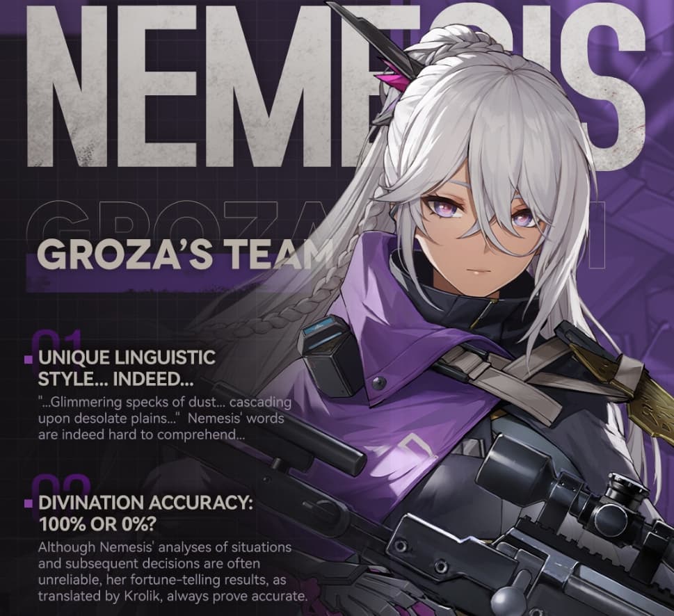 - Peacekeeper of the Team: Capable of employing various tactics to resolve conflicts within Groza's Team, Colphne is an indispensable assistant for Groza who struggles with interpersonal relationships.