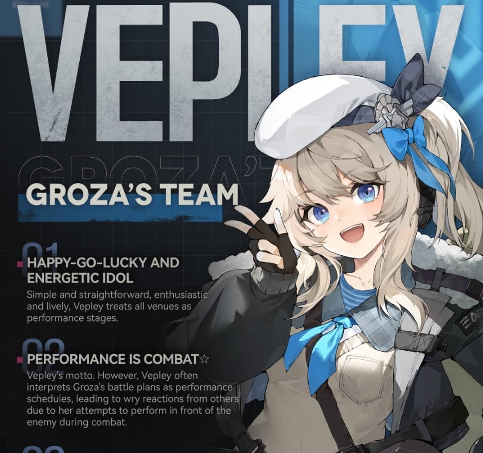 - Performance is Combat☆: Vepley's motto. However, Vepley often interprets Groza's battle plans as performance schedules, leading to wry reactions from others due to her attempts to perform in front of the enemy during combat.