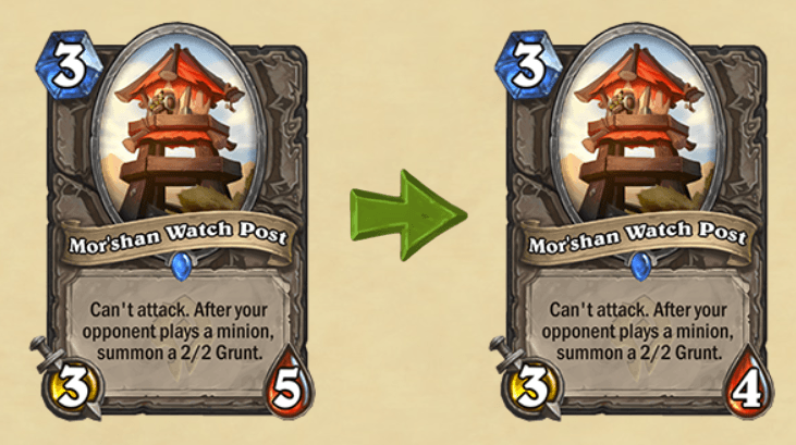 Originally printed with 2/4 and 3/5 stat lines the two best Watch Posts, Far and Mor'shan, dominated the early hours. Dealing four damage early was a near-impossible feat, and taking down a 3/5 without minions was dubious at best. These cards completely stifled the play patterns of everyone's opening turns. Finally the nerfs came and the Watch Posts took a back seat, but the mark left by their constriction was undeniable. These cards began a new trend that would continue to shape the format: extremely powerful Neutral minions.