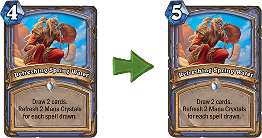 Each player gets one additional mana crystal every turn. Traditionally, on turn three, you can only play one or two cards. Those that break this pattern tend to be extremely powerful, and Forged in the Barrens brought several. Soon, many were nerfed: Refreshing Spring Water was not-so-affectionately referred to as Pot of Greed, and Sword of the Fallen was a mandatory card to play in Paladin.