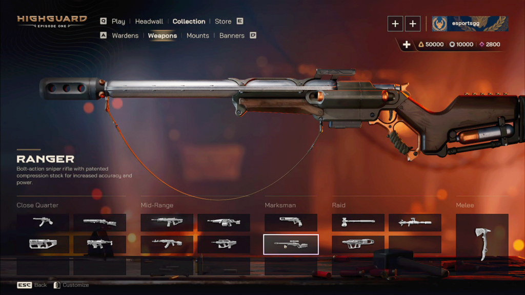 The Ranger Sniper Rifle is currently the only sniper weapon in Highguard and it packs a punch. A body shot deals 85 damage and you’ll deliver an explosive 148 damage for a headshot. The Ranger scales incredibly well with upgrades, and excels in the Intercept Stage.