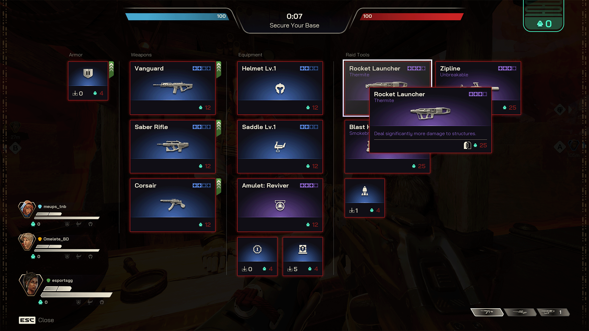 Each player will also carry one Raid Weapon, either a Rocket Launcher, a Zipline or a Blast Hammer. These weapons are primarily intended to destroy or avoid walls during the Raid phase. You can also discover upgraded versions of all three base-attack weapons in chests, and can swap them out mid-game.