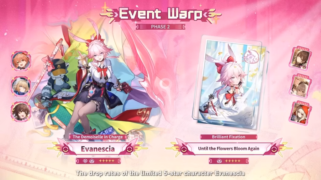 Phase 2 will feature the second new 5-star character, Evanescia. She is a Physical character on the Path of Elation. She becomes available along with her Signature Light Cone, Until the Flowers Bloom Again.