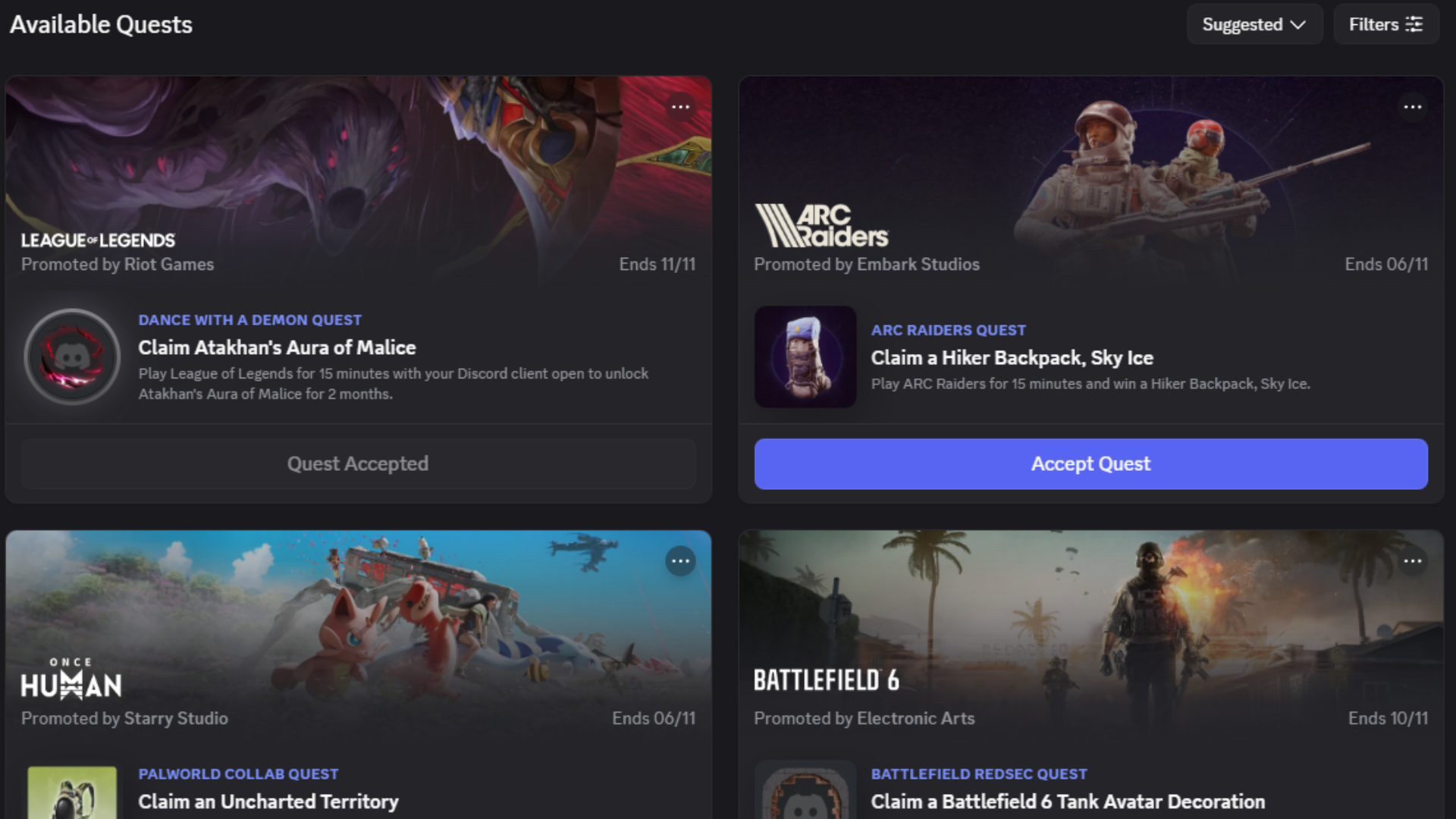 Once you activate the quest, it will be the first to appear on your menu. You have until Nov. 11 to claim this reward. After that day, you won’t be able to collect the decoration. You’ll need to wait for upcoming partnerships between Riot Games and Discord to have a new one.