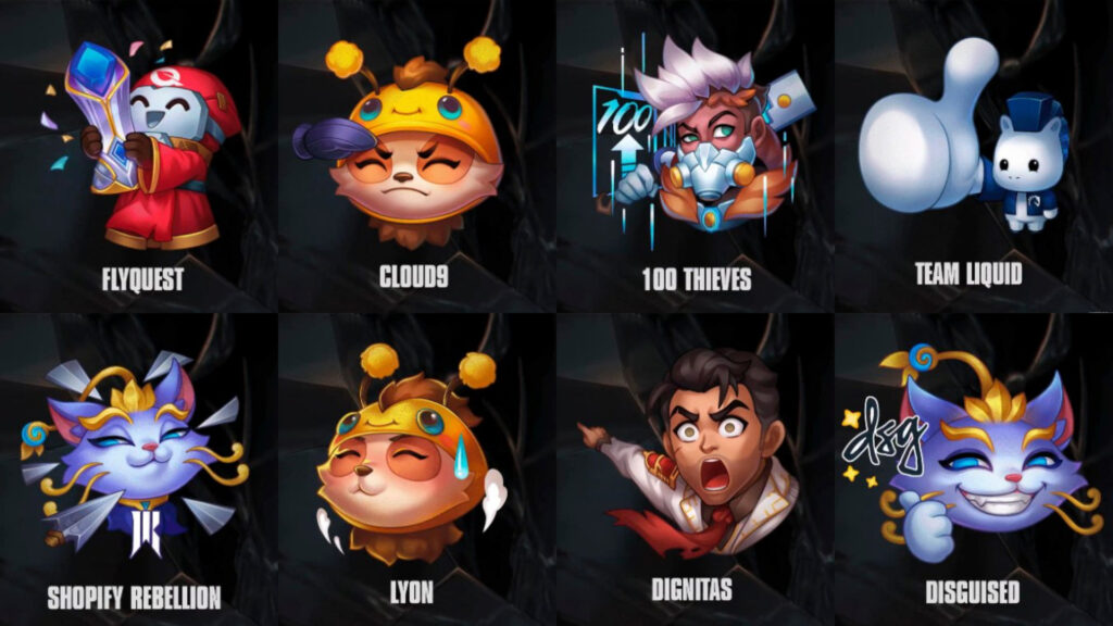 For the League of Legends Championship of The Americas (LTA) North region, players can grab emotes for FlyQuest, Cloud9, 100 Thieves, Team Liquid, Shopify Rebellion, LYON, Dignitas, and Disguised.
