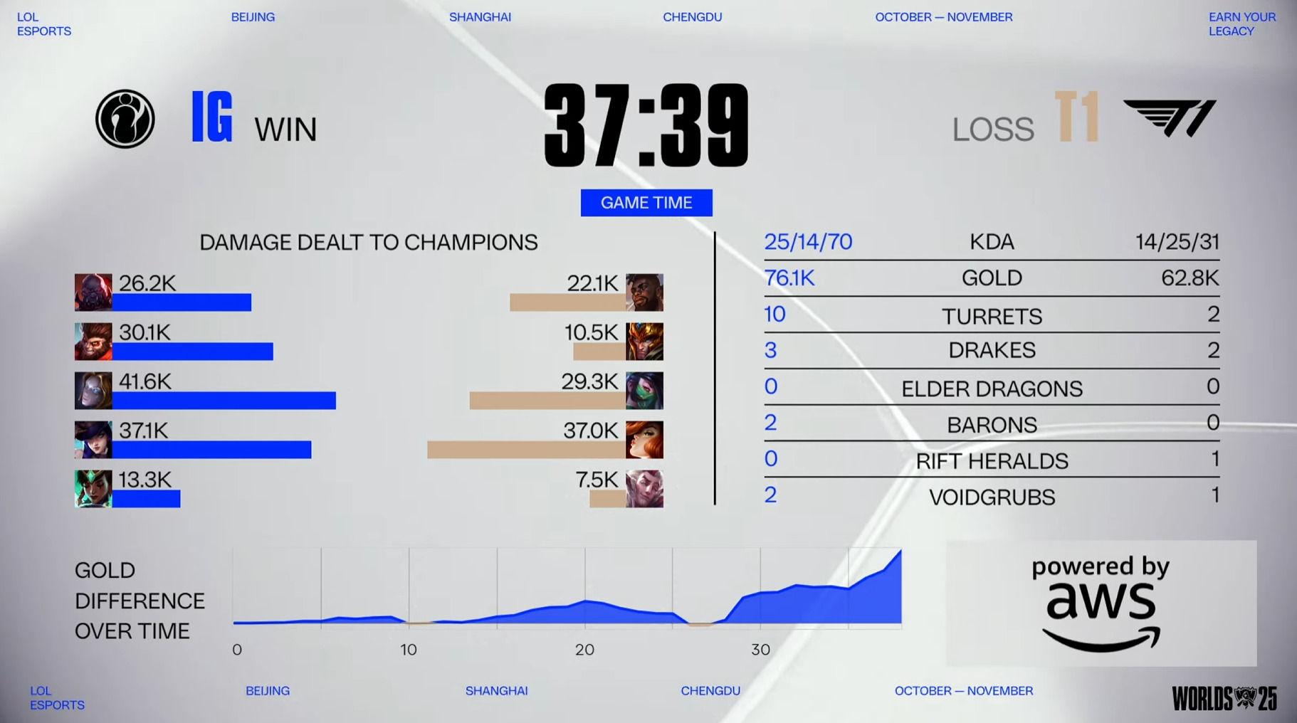 Gumayusi managed to get two early kills, but that was not enough for the individual kills IG was picking up. The game didn’t have much team fighting in the early game, but when they did, IG was stronger and slowly started to build their gold advantage.