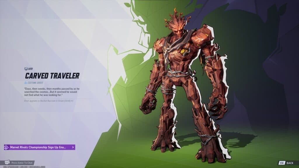 We'll go over all of them, so you know how you can get the Carved Traveler skin for Groot for free, just for playing Marvel Rivals: