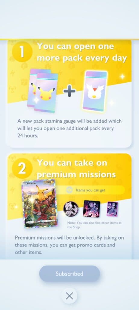 Essentially, this is a way to get more bang for your buck if you plan on spending money in the game. You get the ability to open additional packs per day, a new set of missions, and access to an exclusive Premium Pass shop in Pokémon TCG Pocket.