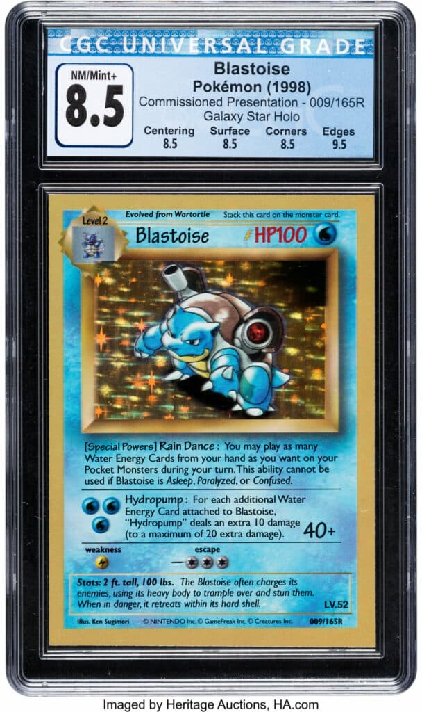 In 2021, a near-mint-graded version of the Blastoise Galaxy Star Holo presentation card surfaced and sold for $360,000.