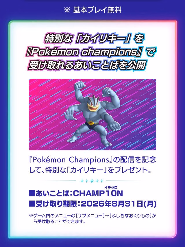 Well, those not looking to trade will be happy to know that for a limited time, you can redeem a free Machamp for Pokémon Champions, the brand new competitive Pokémon title.