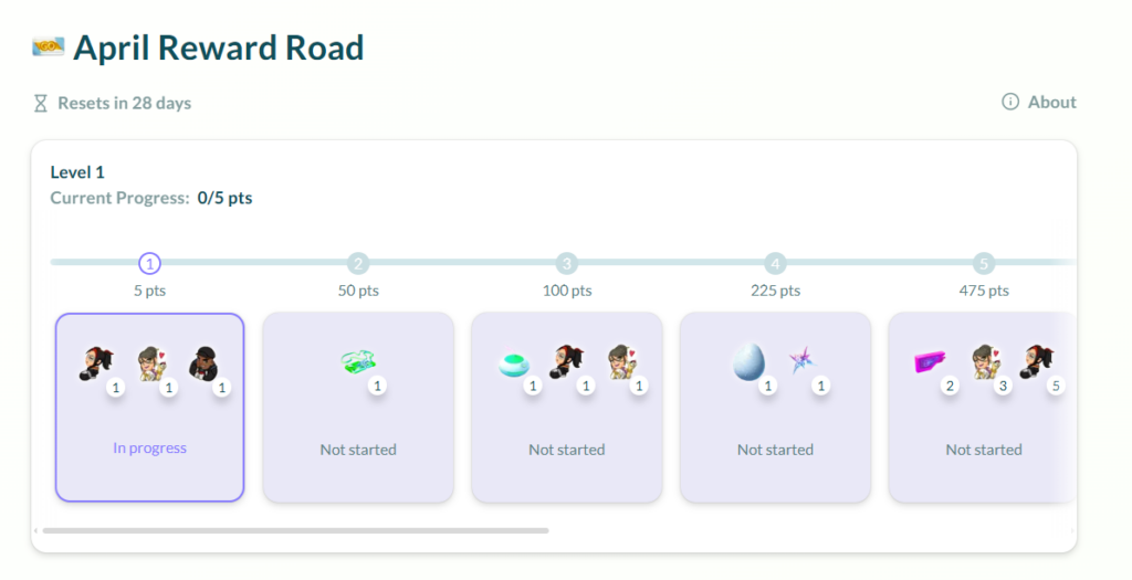 Purchases on the Pokémon GO Web Store earn you double Reward Points. The April Reward Road will last until April 30, 2025, at 23:59 UTC. Reward Points and Reward Road levels will reset at that time.