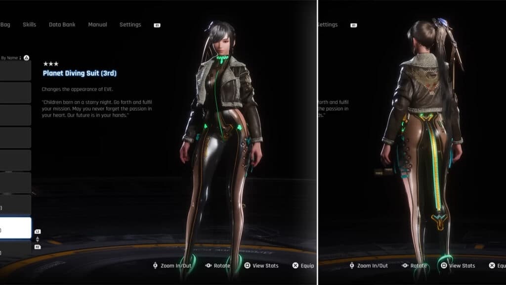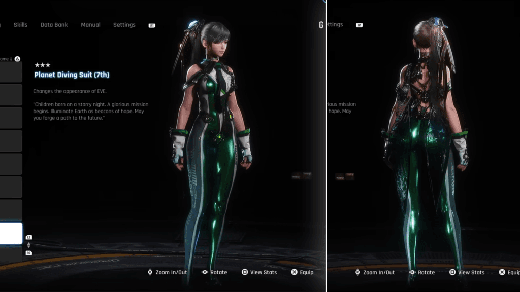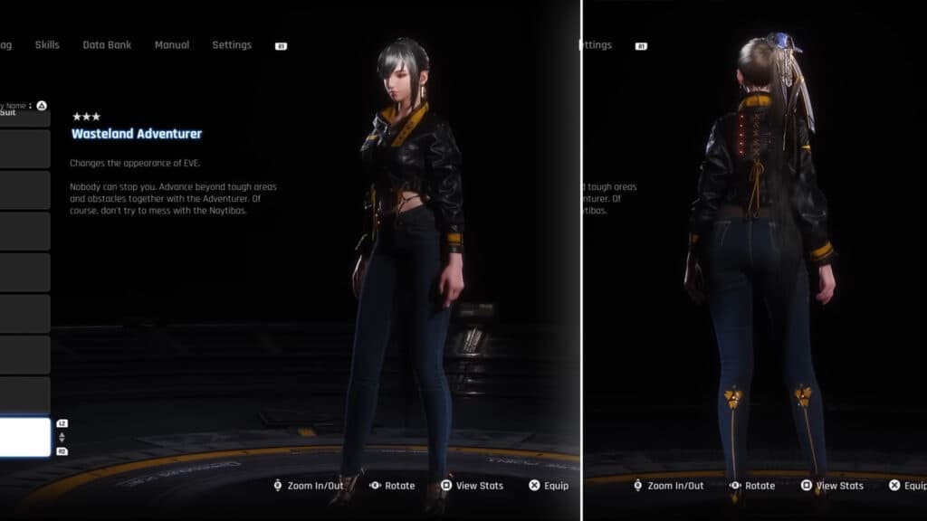 Outfit How to unlock | In Wasteland, head to the northeast. There, talk to a robot named D1G-g2r, who is standing in the middle of his scrapyard. After this, go to the southeast and defeat the Corrupter. You'll find the red chest steps away. | Planet Diving Suit (7th) This is Eve's default armor. You'll get it just by starting a new game. | Remove Eve's Planet Diving Suit (7th) and you'll automatically get the Skin suit in your inventory. Remind, this removes all the armor for your character. | Black Full Dress Design available for purchase from Lyle when you reach Lvl. 2 affinity. | Collect all 49 cans to receive it as a reward. | Black Rose Nano Suit In Spire 4, you'll find a room filled with laser traps that will activate once you approach the crate. Go to the right of the crate and jump your way the button that will turn the lasers off. | In the Great Desert, head to the southeast. Find the broken down buildings with the movable yellow box. Move it, them platform and climb up to find the box with the outfit. | In Xion, there's a bulletin board assignment called "Precious Treasure". The mission takes place on the Great Dessert and you can get the suit automatically as you progress on this mission. | Head to the northeast corner of the Wasteland map to find a rope that leads to a chest. You will be faced with a shooting target challenge, make sure to hit only the white ones and ignore the red ones. | Find the oasis pool in the Great Desert and swim your way to the chest. | Design available for purchase from Roxanne when you reach Lvl. 3 affinity. | Daily Biker Design available for purchase from Lyle when you reach Lvl. 2 affinity. | Daily Denim Design available for purchase from Lyle when you reach Lvl. 3 affinity. | Daily Force In Matrix 11, find an area with living plants and a ladder that leads to a camp. Climb and jump across it, and you'll find the suit inside a box. | Daily Knitted Dress Found in Matrix 11's Subway Station after the fight with Skill Gunner. Go inside the train car on the left, and head to the end of the right side. There, you'll find the box that contains the suit. | Daily Mascot Head to the Underground Sewer in Matrix 11 and go down the tunnel. You'll find a lot of enemies, one of them will leave a big hole on the wall as it reveals itself. Defeat them, go through the wall and you'll find the chest next to a dead body. | Daily Sailor Go inside the broken building in the northwest area of the Great Desert. Find the dead body, shoot the explosive next to it and you'll reveal an orange box. Use it to climb the rubble and you'll find the chest. | Obtained from Jett, who lives in Xion. Complete the story missions in Matrix 11 for him to give you the side quest that unlocks this reward. | Junk Mechanic Design available for purchase from Lyle when you reach Lvl. 3 affinity. | Design available for purchase from Roxanne when you reach Lvl. 3 affinity. | Gifted to players after update 1.003. | Gifted to players after update 1.003. | La Vie en Rose Accept the "Recruit Passcode Specialists" mission from the Bulletin Board. Then, collect the six "Chapter of Trial" documents to receive a special code. After that, go to the wrecked ship and enter the code that's blocking the gate. | Motivation When reaching Eidos 9, you'll find a roller coaster that will get you to the rooftop of a building. As soon as you land, search around for the box containing the suit. | Design available for purchase from Roxanne when you reach Lvl. 3 affinity. | Play the Boss Challenge mode and complete all challenges on Normal mode or higher. | Catch every fish in Stellar Blade and talk to Clyde to obtain this outfit. | Orca Engineer Jump around the camp in Spire 4 that you find after the first Belial encounter. Behind the wall, you'll find the chest containing the suit. | Design available for purchase from Roxanne when you reach Lvl. 2 affinity. | Photogenic Finish the boss fight in Spire 4 that happens in the "Prestige Lounge" (Orca Space Station). Then, you'll be able to open the chest. | Design available for purchase from Roxanne when you reach Lvl. 2 affinity. | Planet Diving Suit (3rd) In Abyss Levoire, find the camp and enter the room next to it. A laser trap will activate, shut it off by defeating all the enemies in the room. This will unveil the chest containing the suit. | Planet Diving Suit (6th) You'll find a partially-submerged building in Eidos 9 made out of pillars. Swim there as fast as you can and climb to the roof. There, you'll find the chest. | Planet Diving Suit (7th) V2 In Eidos 7, follow the monorail. When you get off of it, go down the stairs and open the door by the end of the corridor to reveal the chest. | Design available for purchase from Roxanne after beating the endgame boss fights. | Found in a chest in Eidos 9, close to the exit of the parking garage. You'll have to drop to a platform found on the left side of the yellow ledges. | Racer's High Find the cliff close to the camp on the east of the Solar Tower. Jump down to find the chest. There's a wooden box for reference. | Reward for completing the game. | Red Passion Found in Eidos 7 after breaking a wall with the crane. | Sky Ace In Xion, find Kaya at Sister's Junk. Complete her side quest "Encounter" to get the nano suit as a reward. | Sporty Yellow You'll have to defeat an enemy as a part of the "Life of the Scavengers" mission. The enemy will leave a crate behind, enter it and claim the suit from a chest. | Only available as a Special Edition bonus reward. | Wasteland Adventurer Exit the Warehouse 77 in Eidos 7. On the opposite side of the bottom floor, find the chest containing the suit right in the corner. | Purchase from Clyde in the Great Desert Oasis for 1,500 Fishing Score. | Purchase from Clyde in the Great Desert Oasis for 1,500 Fishing Score. | FourSeconds Black Included with the November 20, 2024 Update | FourSeconds Everyday Wear Included with the November 20, 2024 Update | Included with the November 20,