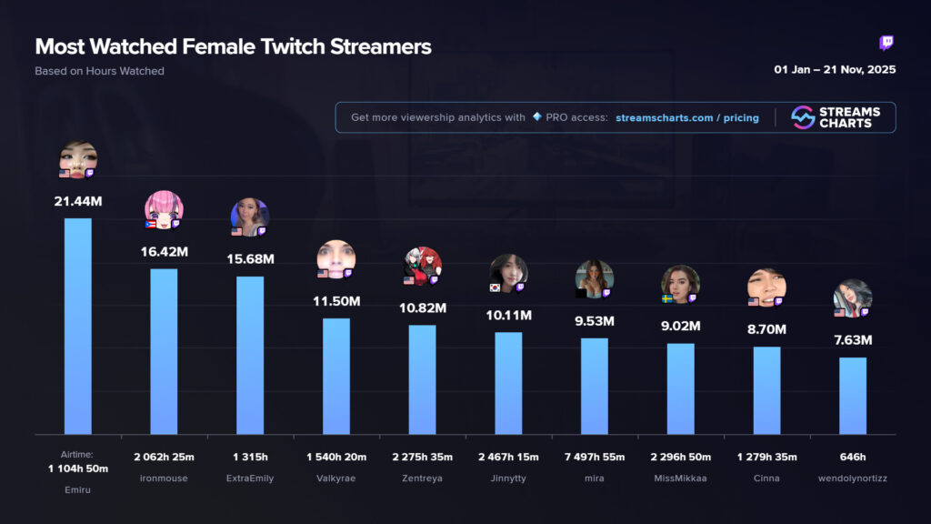Emiru easily stands as one of the biggest streamers in the world, which makes it quite obvious how she was able to get herself to number one on Streams Charts’ list of the top 10 female Twitch streamers in 2025.
