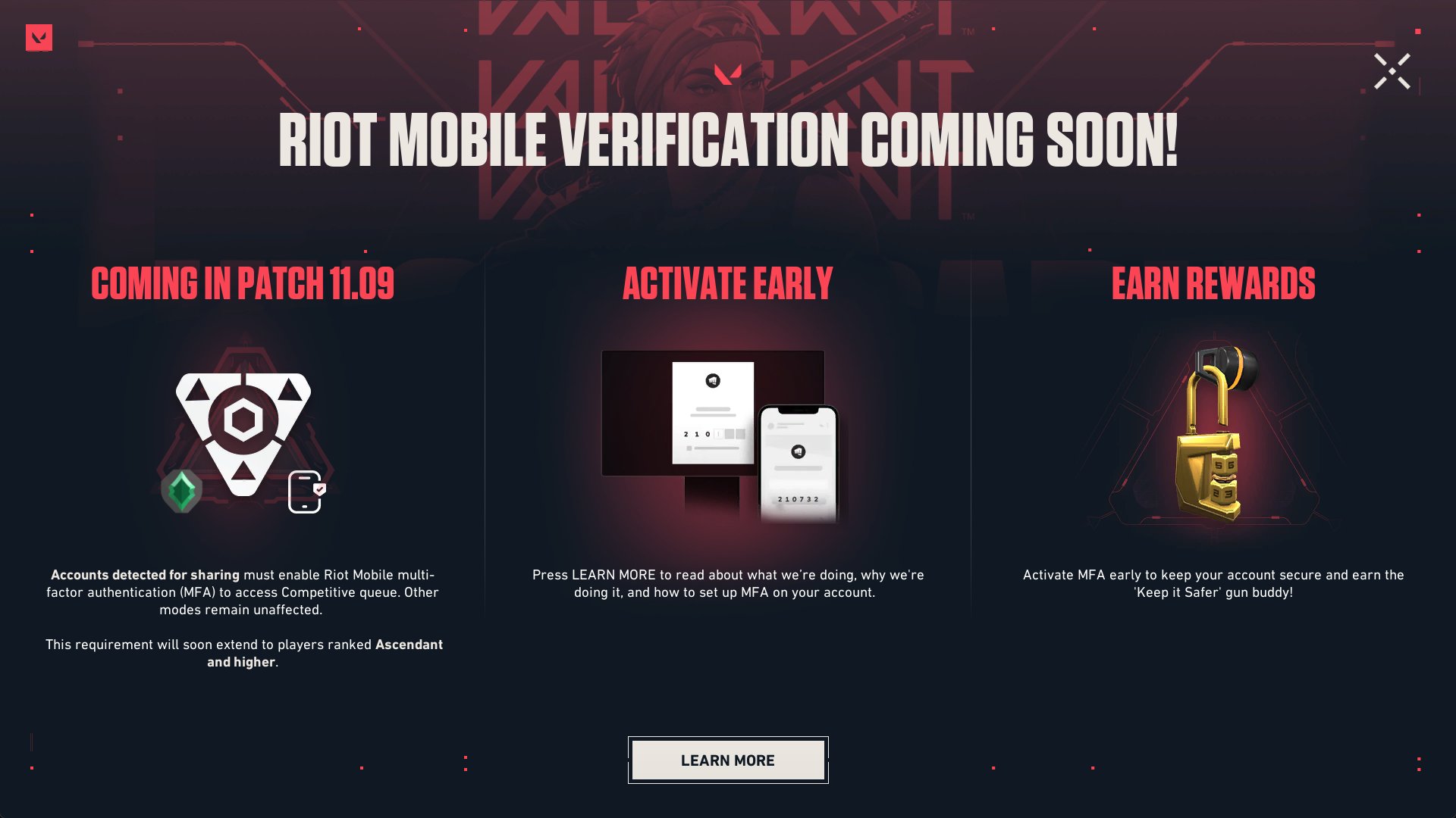 For a while now, Riot Games has been working on targeting smurfs in your ranked queues. Starting from VALORANT patch 12.01, all European (EU) accounts detected for sharing and all Ascendant+ players must enable the Riot Multi-factor Authentication (MFA) to access the competitive queue.
