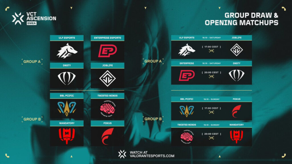 The matches kick off on Oct. 18 with the two Ascension Matches set for Oct. 25 and Oct. 26. The matches for each day of the Group Stages will start at 5 p.m. CEST. Ascension Matches will start at 6 p.m. CEST on their respective days.