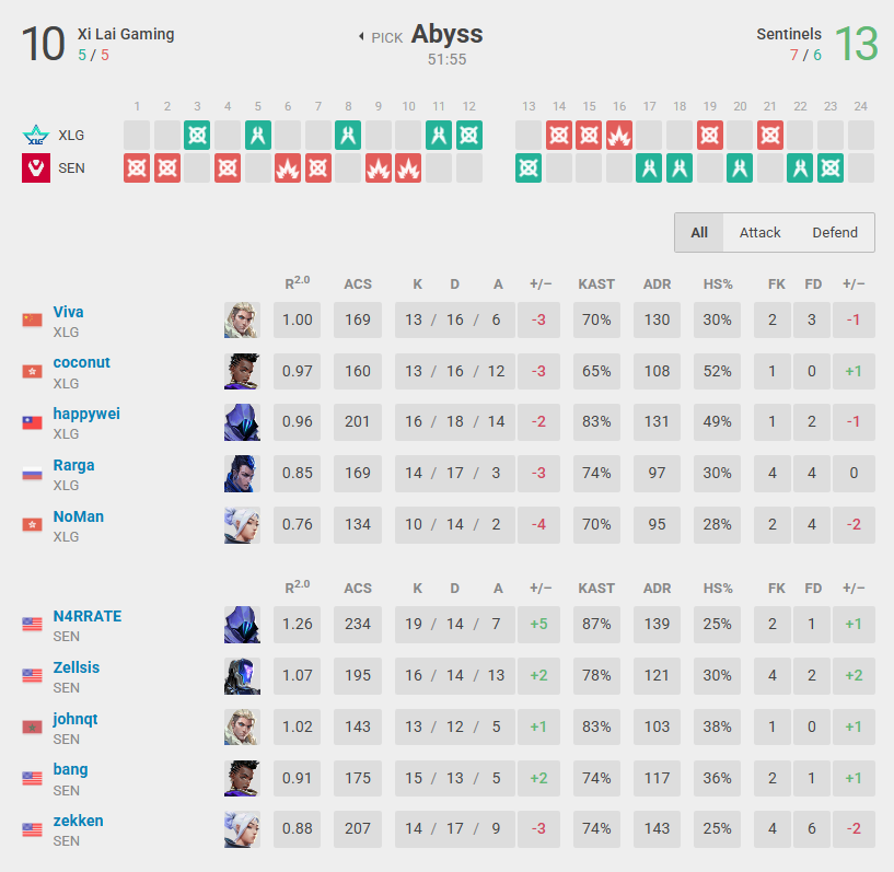 The first map between XLG and Sentinels was tightly contested, with mistakes on both sides keeping the game balanced and preventing any single player from standing out. As the rounds progressed, however, Sentinels gradually took control and closed out the map with a narrow 13-10 victory. N4RRATE was crucial for this victory due to the great use of Omen’s kit.
