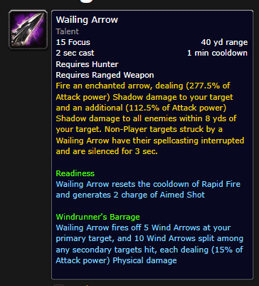 Wailing Arrow offers wonderful utility in Mythic+, with a caveat. In order to maximize its silence you must be able to predict and react to enemy mob cooldowns. Otherwise, it's easy to mess up your shot and not land the Silence. If we're being honest, Marksmen Hunters get far more value out of Wailing Arrow and Beast Masters are much better leaving it alone.