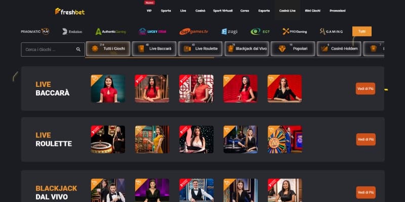 Se sei in cerca di giochi da tavolo dal vivo, infatti, nel portale di Freshbet troverai un casinò live ben strutturato e fornito.