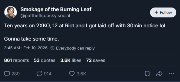 Patrick Miller, who has been with Riot Games since 2013, said that he got laid off with a 30-minute notice. He first worked on League of Legends as an editor-in-chief from 2013 to 2015, before moving to the 2XKO team as a game designer and senior producer from 2016, before being laid off.