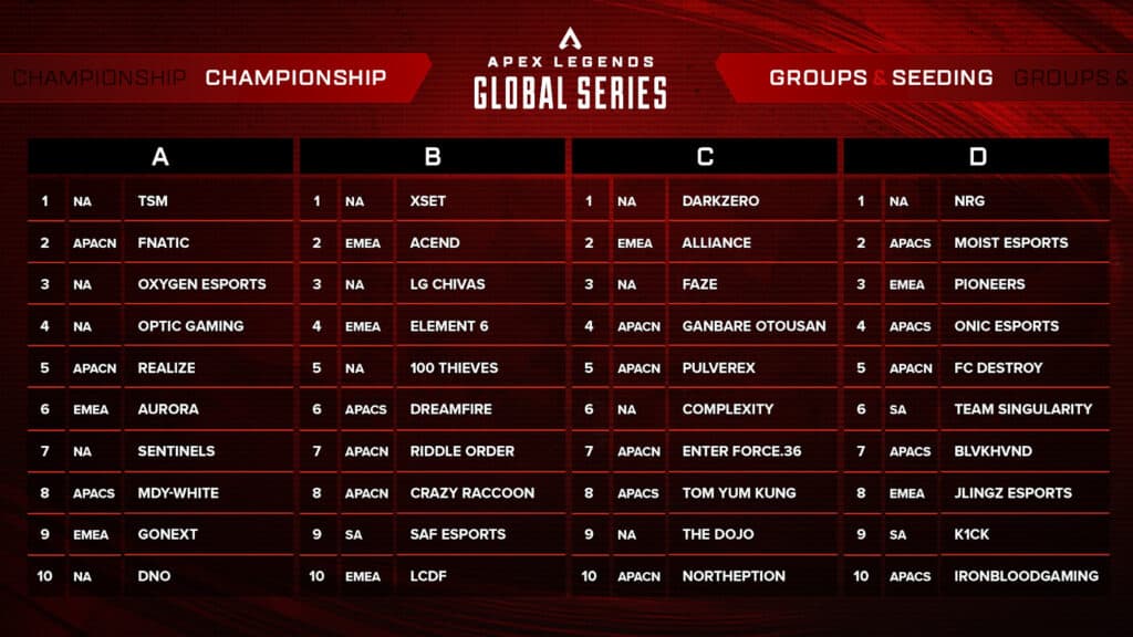 Teams have been snake seeded based off their 'playoff points' into the four ALGS Championship groups. Each group will play a six game series against every other group. Total scores will be tallied, and the top 20 and bottom 20 teams will head to the upper and lower brackets.