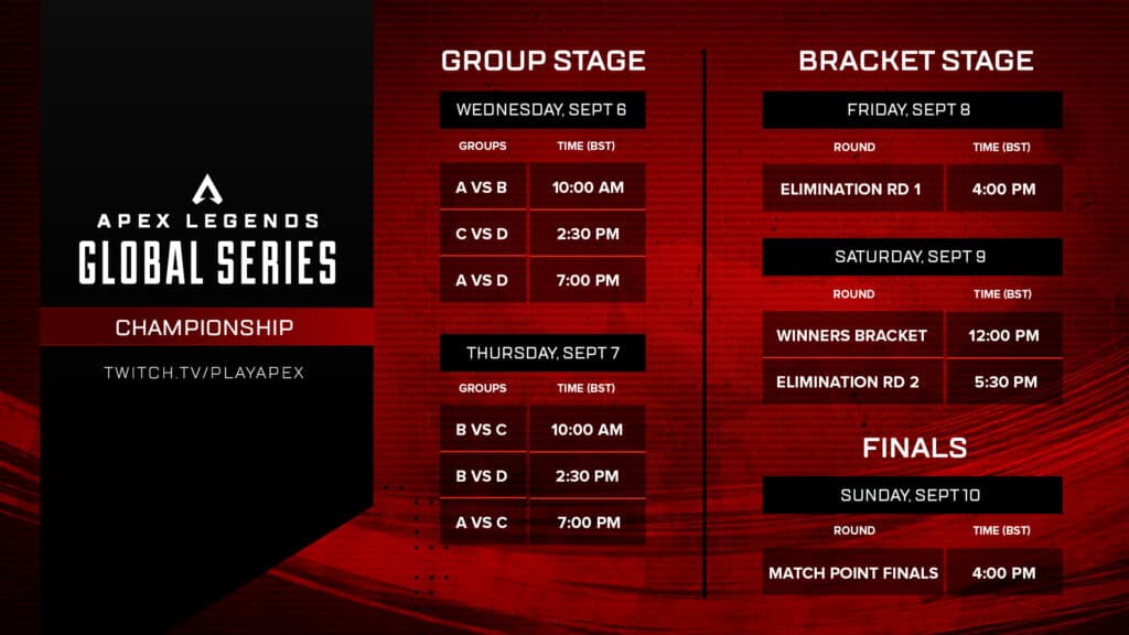 The ALGS Championship will be played over five days, a day longer than the playoff LANs. While the group stage will remain six matches per set, the bracket stage will be expanded to eight games.