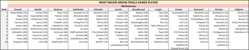 No legend has made it past the 200 games played in grand finals mark in either region. However, the top legend Wraith, is on the cusp. Its no surprise that Wraith is there with 192 total grand final games. She has been insanely popular since day 1 due to her kit. She has been seen on almost every team composition since early competitive Apex, and for good reason.