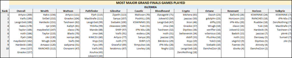 Unfortunately, in EMEA the number of games are close but not as high. The Apex scene in EMEA is not on the same level of popularity of NA, and so the number of grand final games lower. The player who’s played the most in grand finals is Gambit’s Artyco with 200 games, followed by Alliance’s Vaifs with 190 games. This is most likely due to most Apex tournaments being held in NA rather than EU.