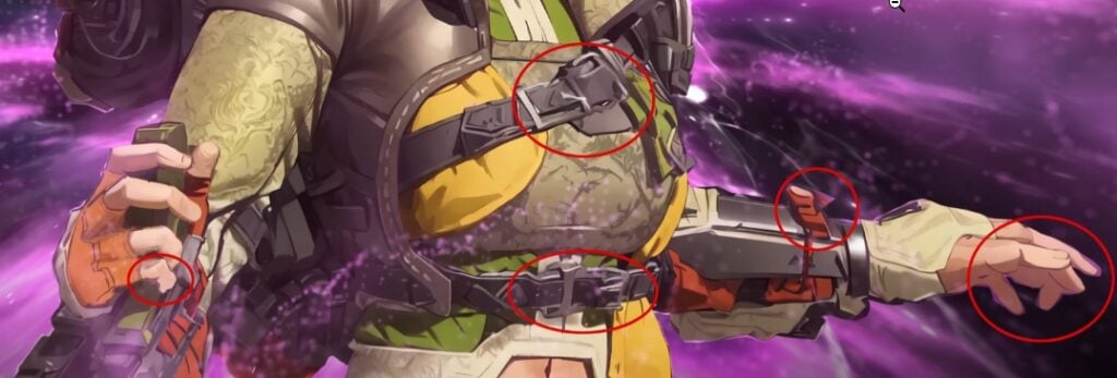 In the promo art for Valkyrie posing as Yuffie from FF7, we can see both of her fingers are warped, as highlighted below. Her right hand has a melting-like aesthetic, a very common problem for AI art as it tries to blend together its reference material. This melting can also be seen on the two belts across her chest.