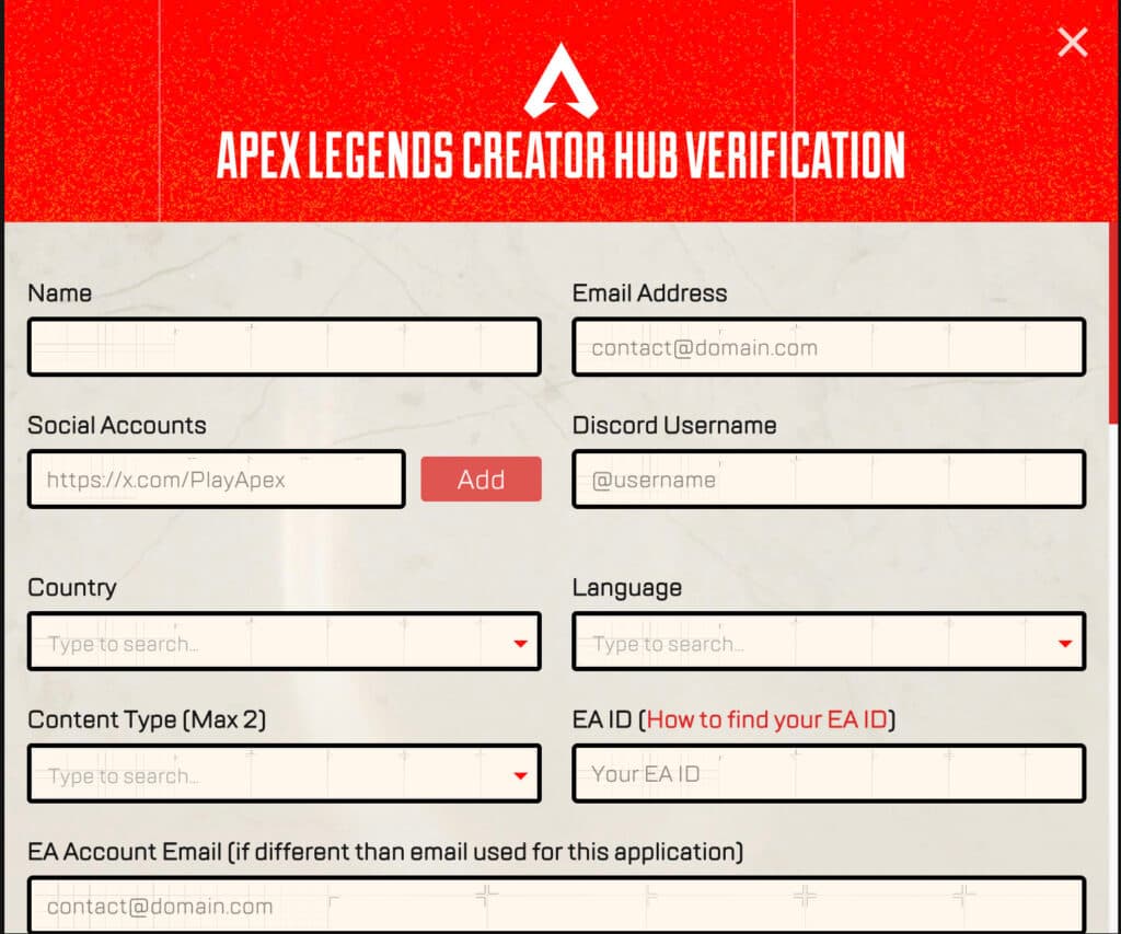 To apply to be an Apex Legends Creator, you'll first be asked to share your key information including your EA account, and you'll be asked to link at least one social media account.