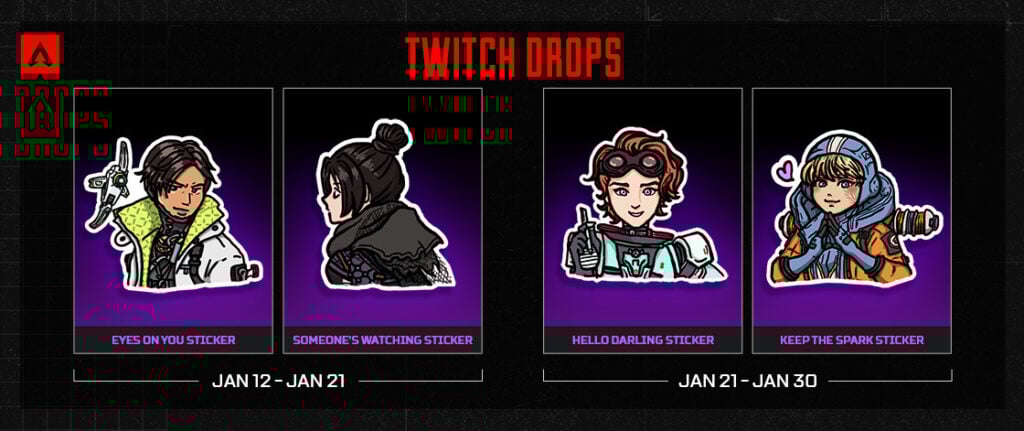 The cherry on top for the Final Fantasy x Apex event are the Twitch Drops that are available throughout the event. There are four different stickers available for the Twitch Drops. Two are available from Jan. 12 to Jan. 21, while the other two are from Jan. 21 to Jan. 30. To claim them, each sticker is rewarded for an hour watched during the time period. So watch your favorite Apex streamer who has drops enabled for two hours between the selected dates to secure them!