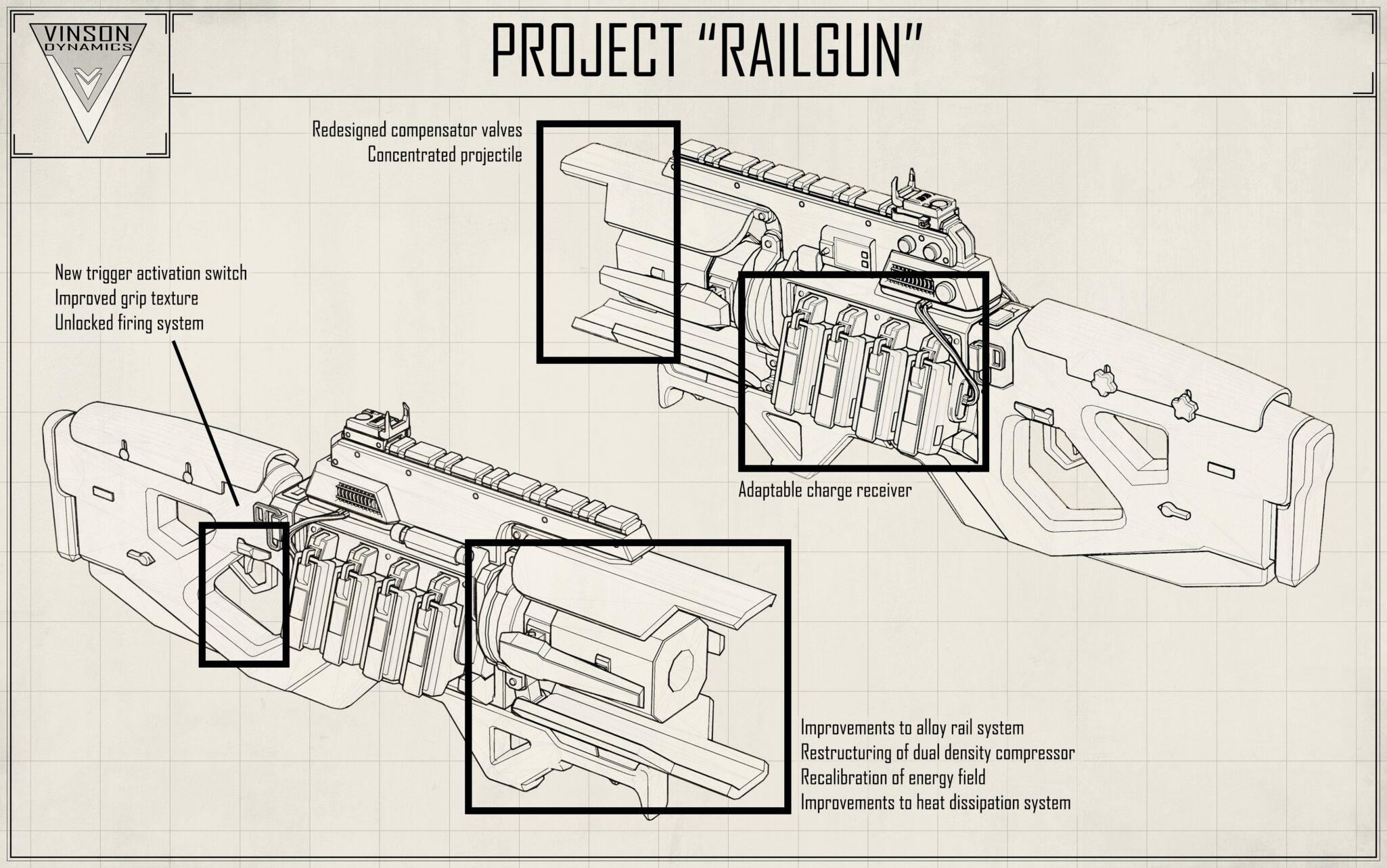 On July 30 EA posted a tweet of the blueprints for what appears to be a new version of the Charge Rifle. While the design looks similar visually, the notes on the blueprint state “redesigned compensator valves. Concentrated projectile“.