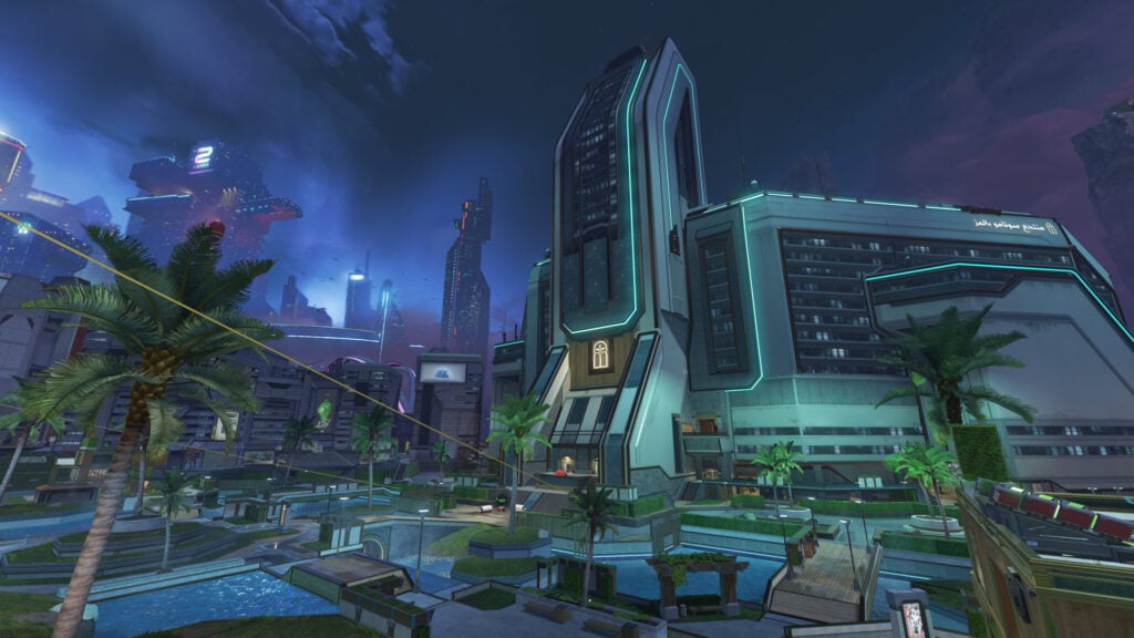 E-District is the latest map and has been overall a major hit with the Apex player base. The map plays out very differently to the other maps in the game thanks to its verticality and high density layout. In particular the map has been popular with the competitive community, which saw the map added to the official ALGS rotation.