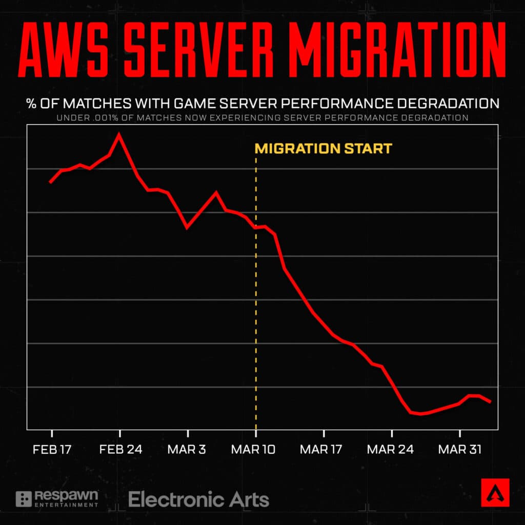 Now, we have information direct from Respawn about how the migration is going. Things seem to be looking good! According to data shared today, there has been a big drop in the number of Apex matches experiencing server performance issues. This is now under .001% of matches.