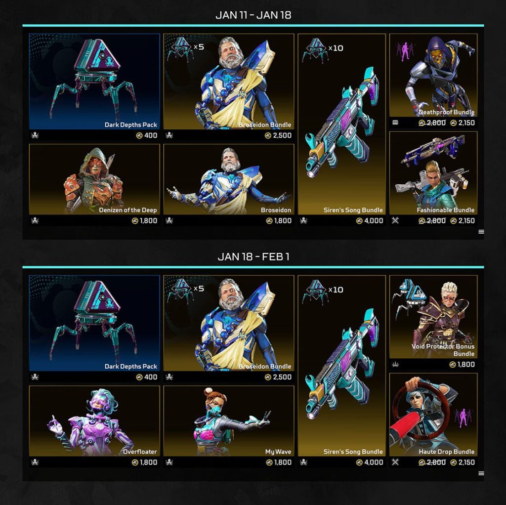 Dark Depths is coming to Apex Legends from January 11 to February 1. It features water-themed Legendary and Epic skins as well as Flash Events with collectibles to unlock. The stunning skins are available in the new Dark Depths packs.