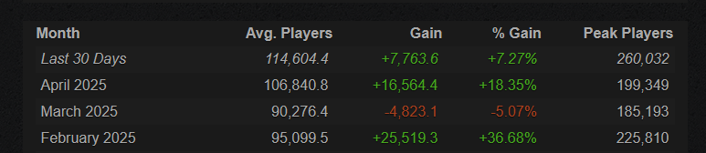 The new strategy seems to be working. Player numbers rose significantly in February 2025 and April 2025 and early stats look good for Season 25.