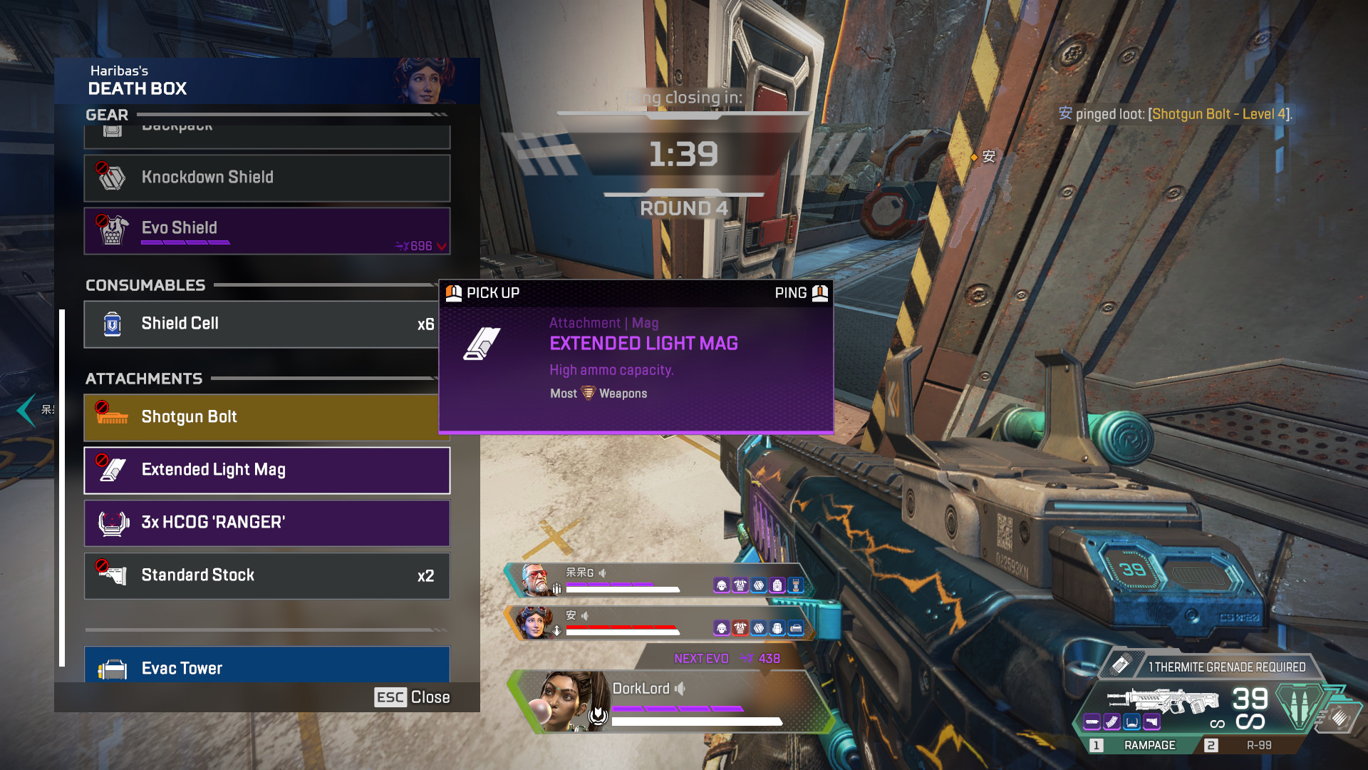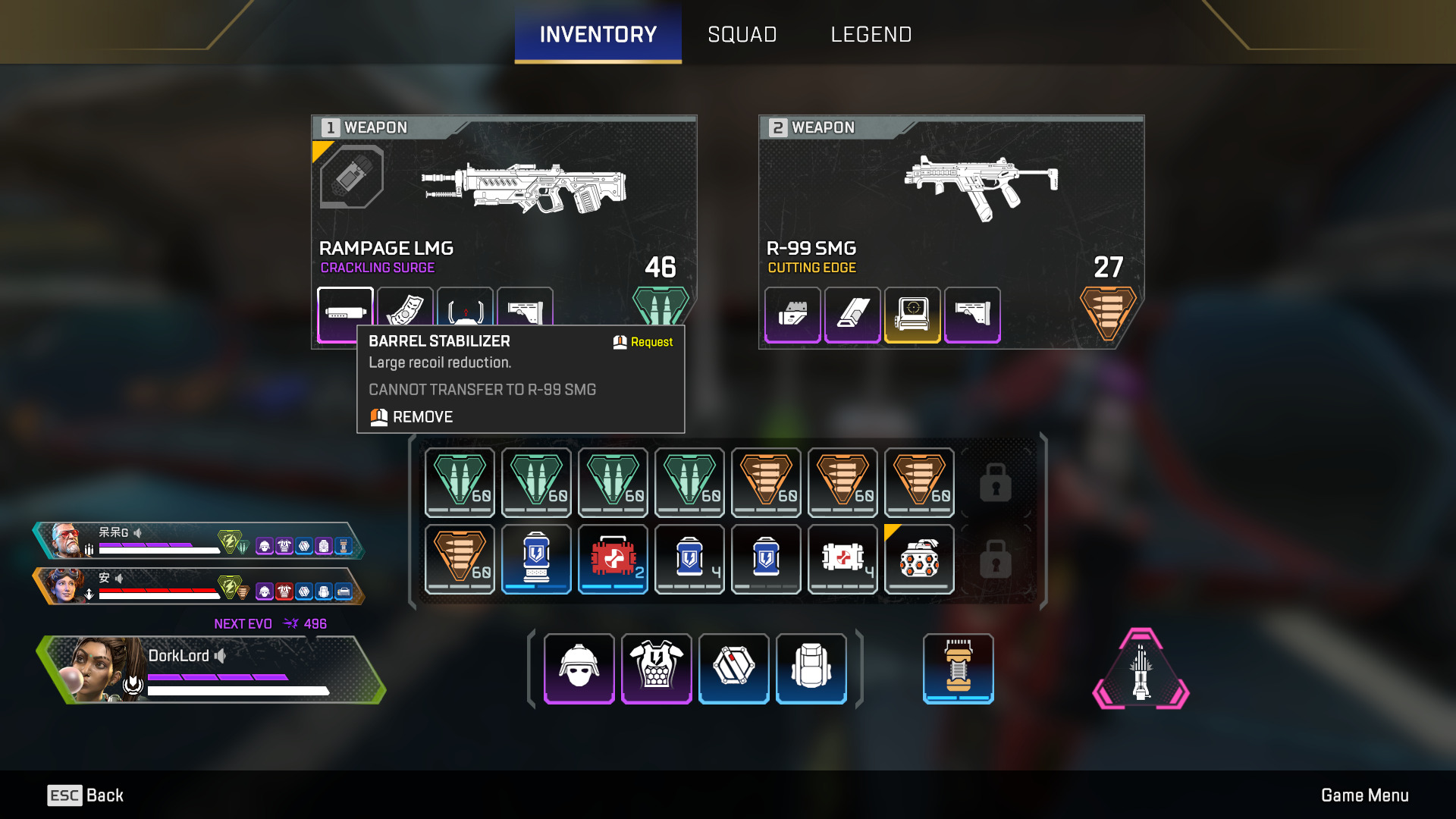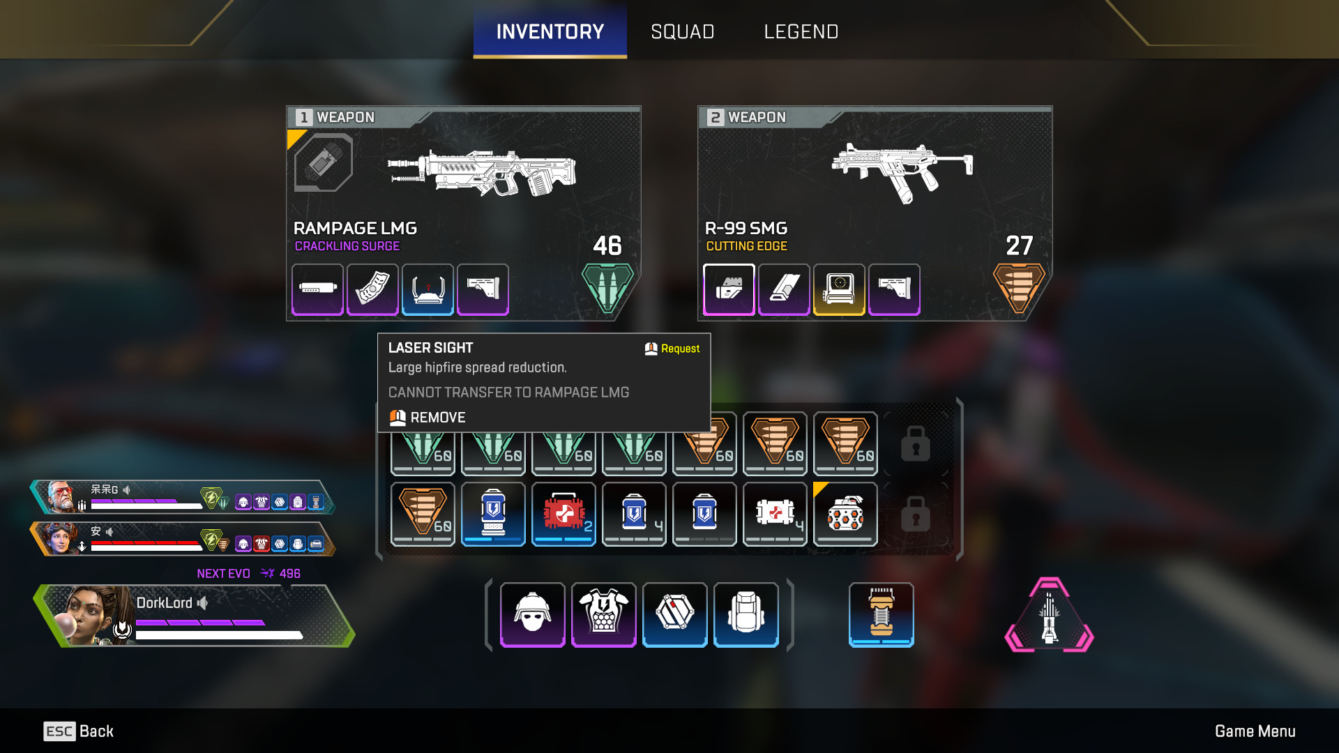 ![]() | Boosted Loader | Legendary (Gold) | Wingman (Unavailable), Hemlok | Reloading with low ammo loads mag with more bullets with a faster reload | Available |